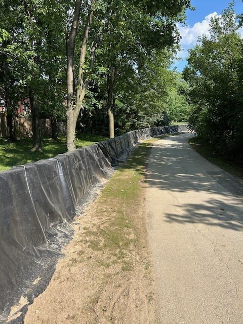 A temporary floodwall installed along Little Etobicoke Creek to block floodwaters should the creek overflow its banks.