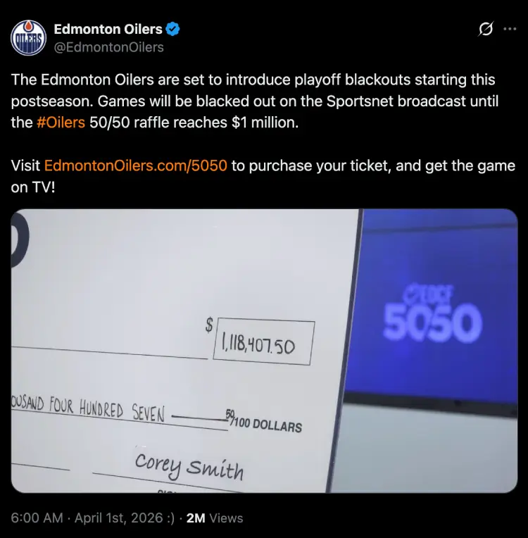 The game telecast will start once the Oilers Community Foundation’s 50/50 pot reaches a minimum of $1 million. If the pot doesn’t hit the mark, no Oilers hockey will be seen on Sportsnet.