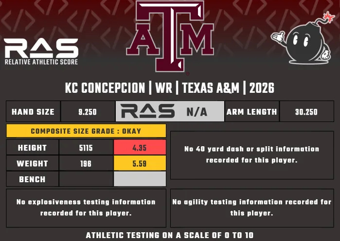 He also has merely average long speed, which could limit his ability to threaten defenses deep at the NFL level. And finally, Concepcion could also stand to continue to hone his craft as a route runner. He has the tools to be a dangerous route technician at the NFL level, but needs to get better at mixing route tempos and using subtle fakes and misdirection to throw off defenders.