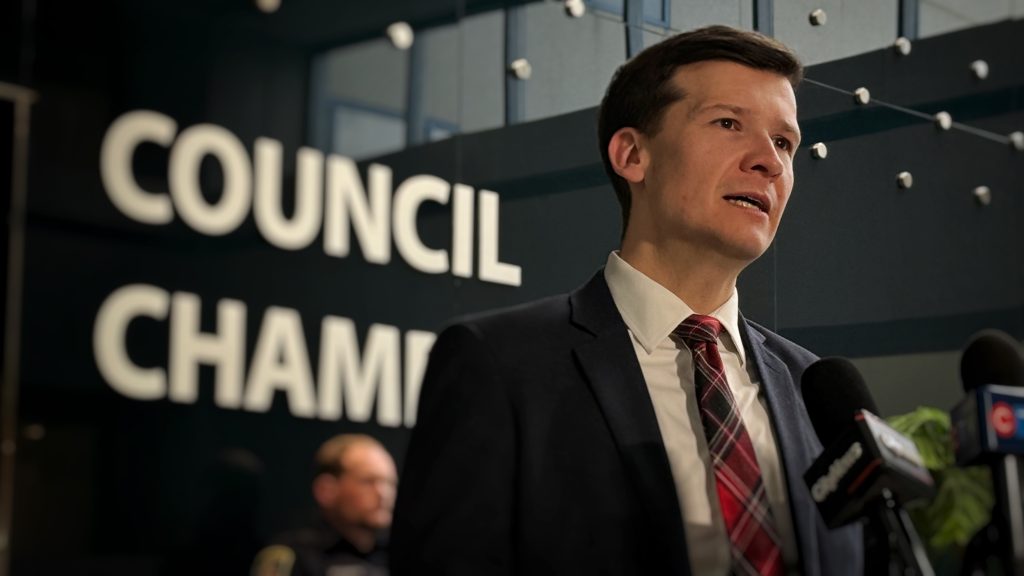 Calgary Mayor Jeromy Farkas outside Council Chambers on Monday, Dec. 8, 2025. (Nick Blakeney, CityNews image)