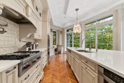 The kitchen This kitchen has quartz waterfall countertops, herringbone flooring, and blends “seamlessly” into the family room (which boasts an onyx back-lit bar). There are also high-end appliances. (Sam McDadi Real Estate Brokerage)