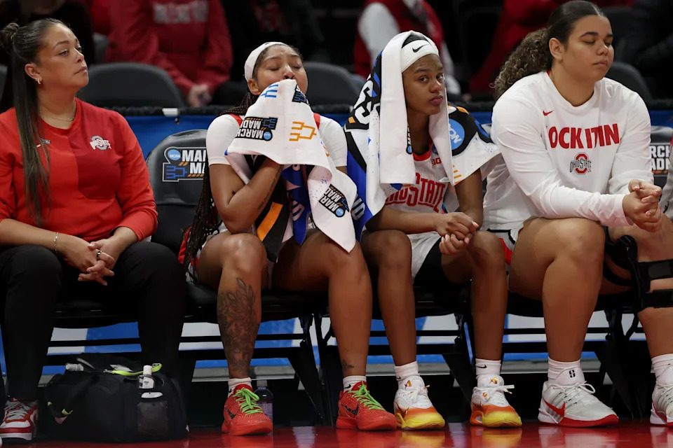Chance Gray #2 of the Ohio State Buckeyes and Kennedy Cambridge #3 sit on the bench as time runs down in the fourth quarter of the NCAA Women’s Basketball Tournament Second Round game against the Notre Dame Fighting Irish at Jerome Schottenstein Center on March 23, 2026 in Columbus, Ohio. Notre Dame defeated Ohio Sate 83-73.