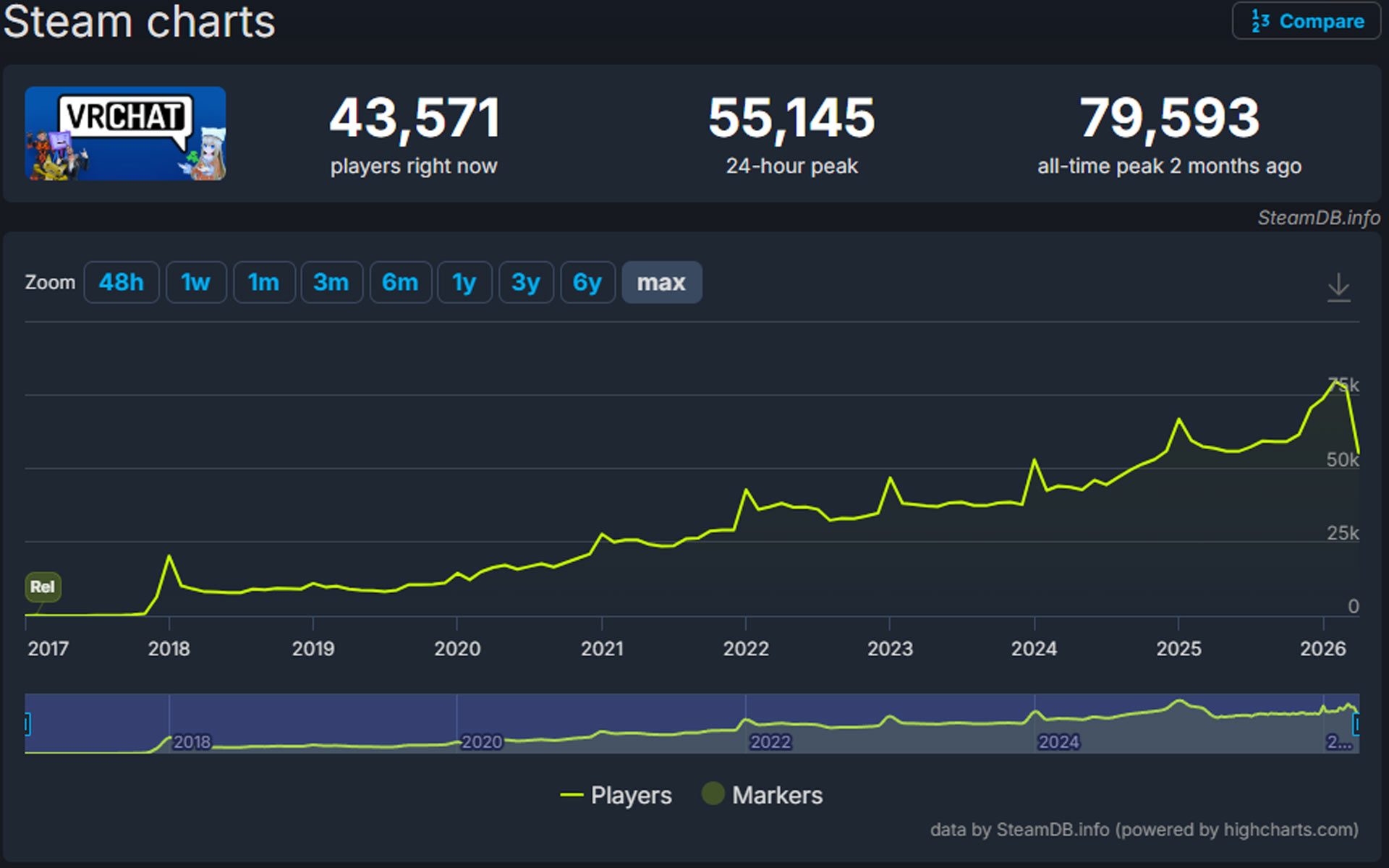 VRChat Historical Peak Concurrents – Steam Version | Image courtesy SteamDB