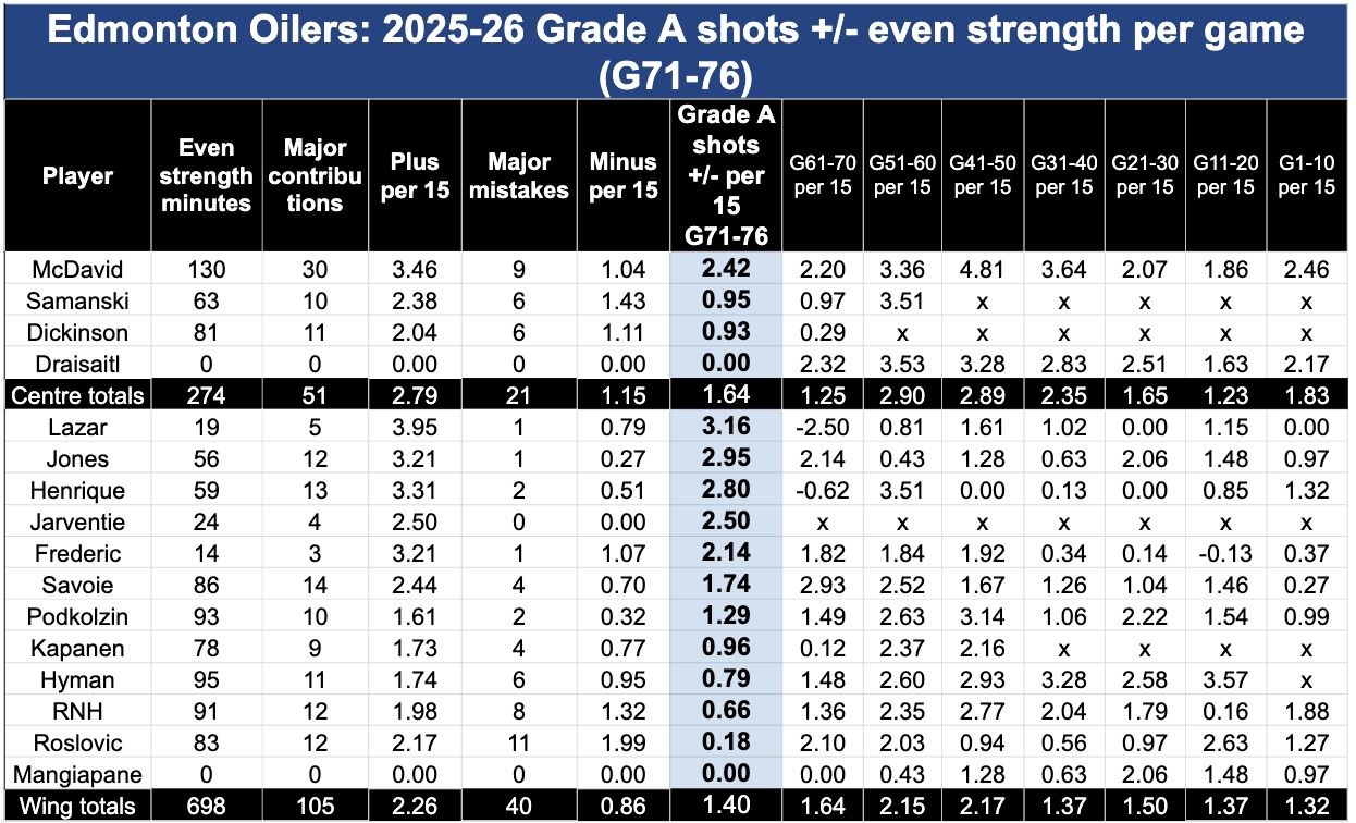 Here’s my depth chart from that time, with Samanski ranked seventh for Oilers centres and Jones eighth for left wingers. But both players have clawed their way up. Other players have been set aside, including traded Andrew Mangiapane, waived Noah Philp, released David Tomasek, injured Mattias Janmark, and demoted Ike Howard.
