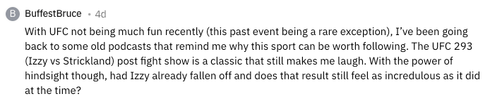 With UFC not being much fun recently (this past event being a rare exception), I’ve been going back to some old podcasts that remind me why this sport can be worth following. The UFC 293 (Izzy vs Strickland) post fight show is a classic that still makes me laugh. With the power of hindsight though, had Izzy already fallen off and does that result still feel as incredulous as it did at the time?