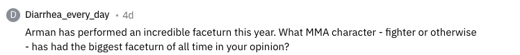 Arman has performed an incredible faceturn this year. What MMA character – fighter or otherwise – has had the biggest faceturn of all time in your opinion?
