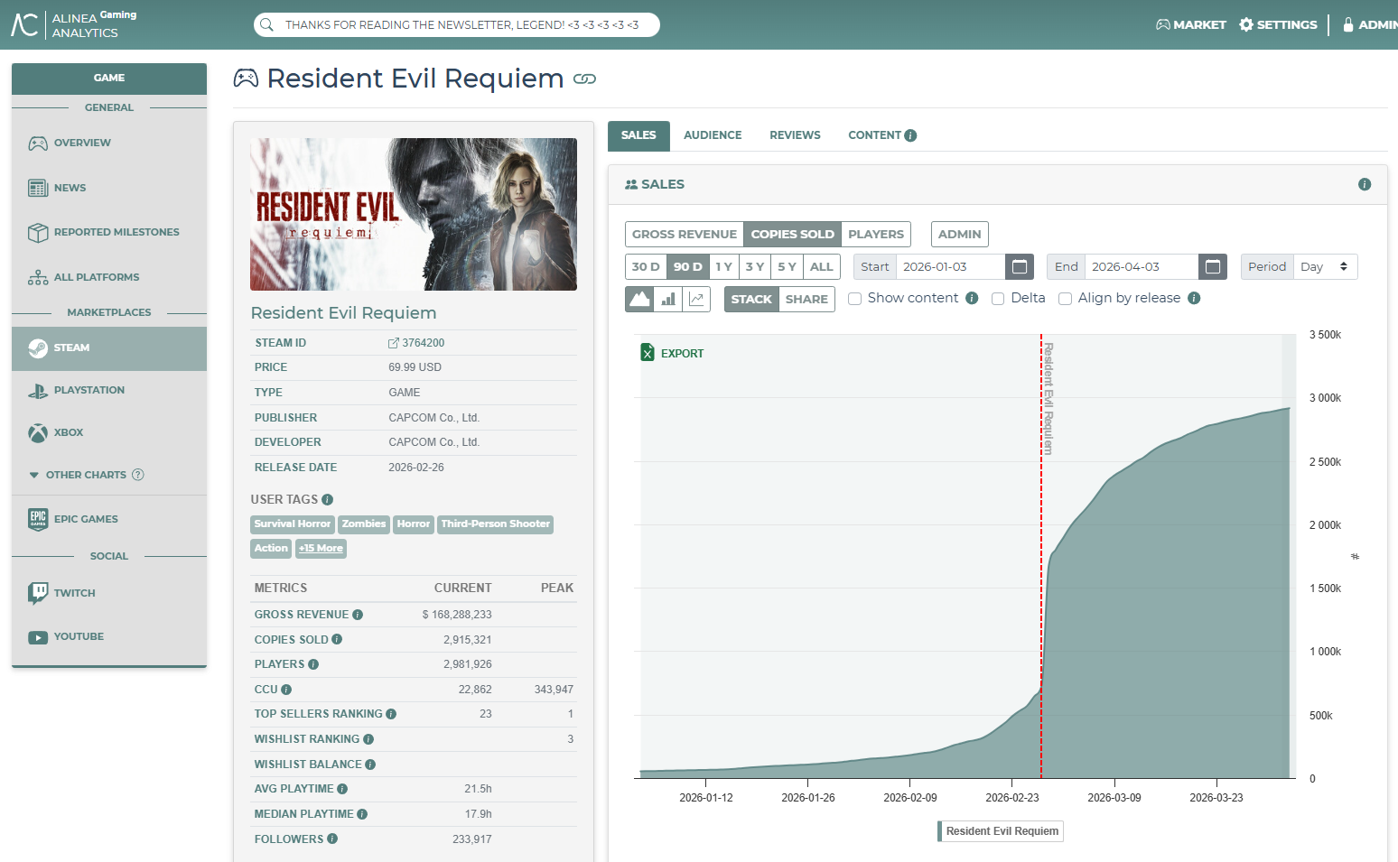 Resident Evil 3’s 2020 remake nearly one million copies on Steam in March. Sure, a bit of this is the halo effect from players Requiem, but the real driver was a massive 90% Steam discount that dropped RE3’s price to $3.99 on March 19. Capcom sold 95% of its March volume during this 11-day window, generating a respectable $8 million in passive back-catalogue revenue. This is another reason for Capcom’s PC-first mindset: the Steam audience is far more receptive to deep, aggressive discounting than other platforms