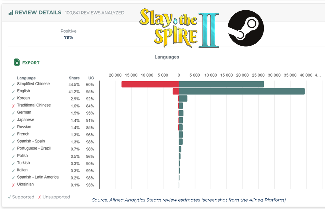 In our platform (get a free trial!), we looked at our language-specific data for over 100K Slay the Spire 2 Steam reviews. While the game maintains a respectable 79% positive user score overall, that average is being heavily pulled down by the Simplified Chinese segment:
