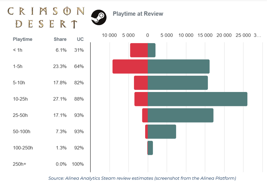 Crimson Desert’s early friction was always worth pushing through, anyway. Our playtime-indexed data shows just a 31% positive user score for players with less than one hour of game time, signalling that Crimson Desert was its own greatest enemy during the first sixty minutes or less.