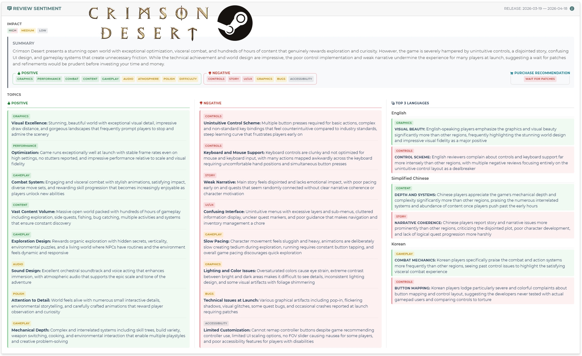 The review data in our platform shows that players love a lot about Crimson Desert. Want to see our sentiment data on your competitor’s game? Reach out for a free trial