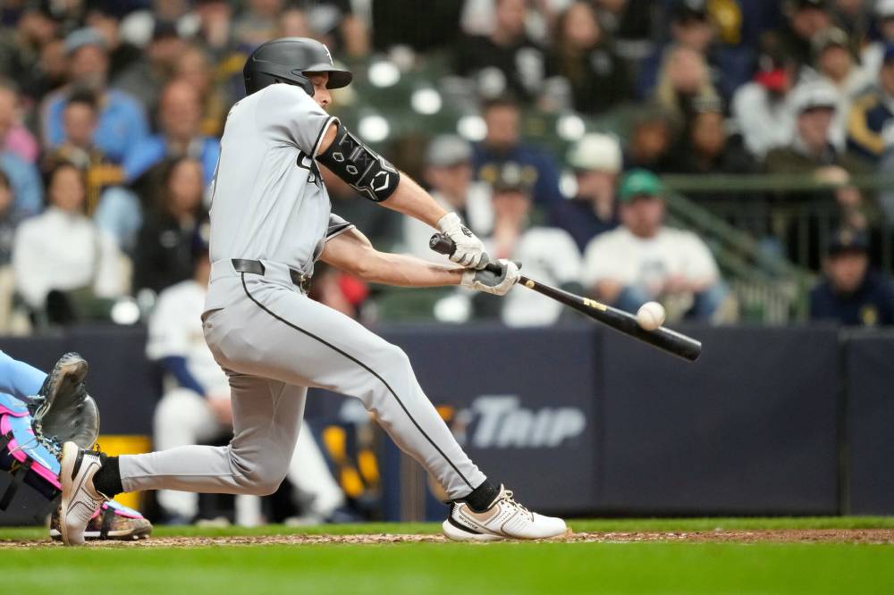 Chicago White Sox and Winkler-product Tristan Peters hits a double during the fourth inning against the Milwaukee Brewers on Saturday. It was the first major league hit for Peters.