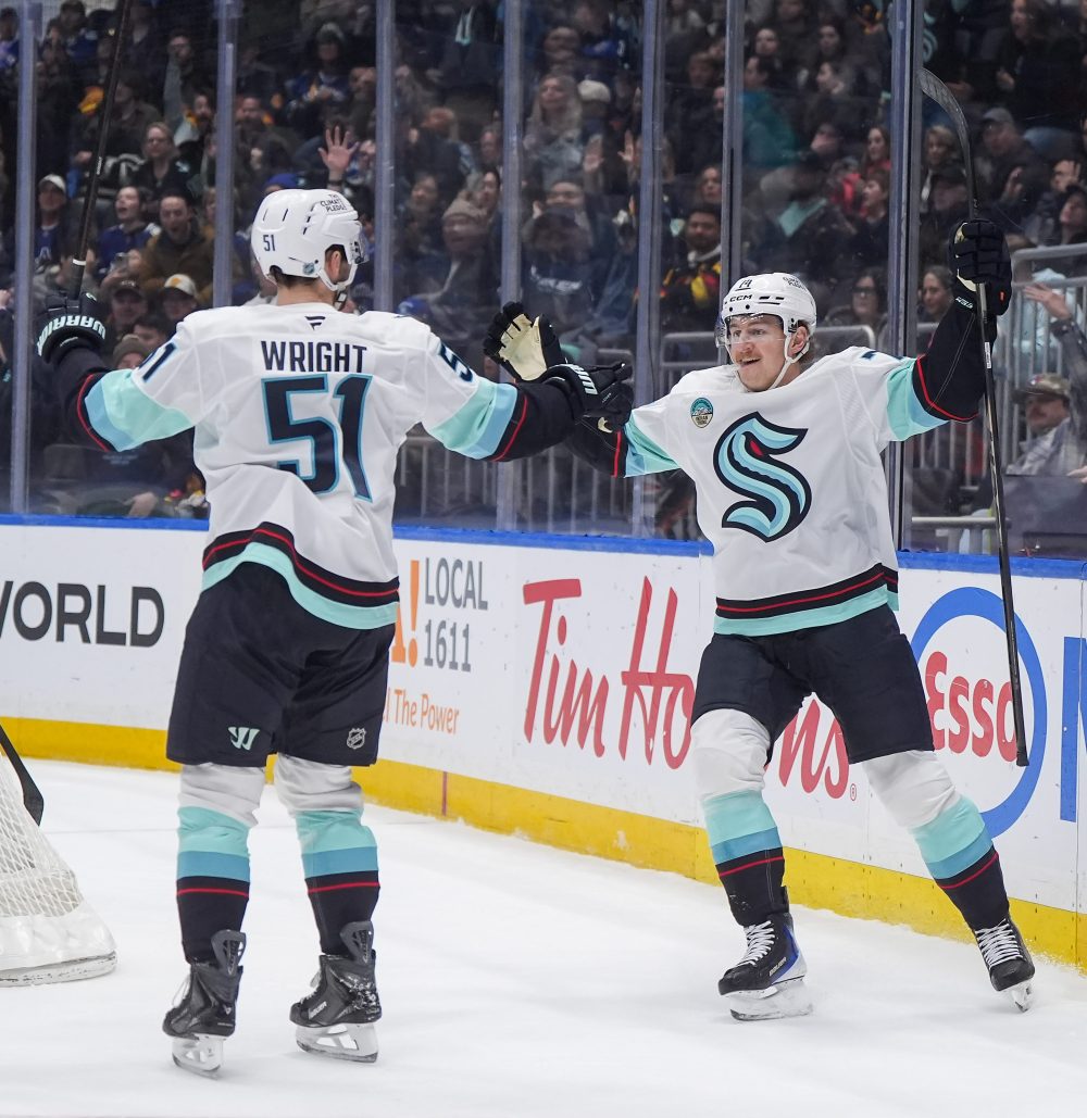 Seattle Kraken’s Bobby McMann, right, is up to a career-best 27 goals and 44 points in 70 games this season.
