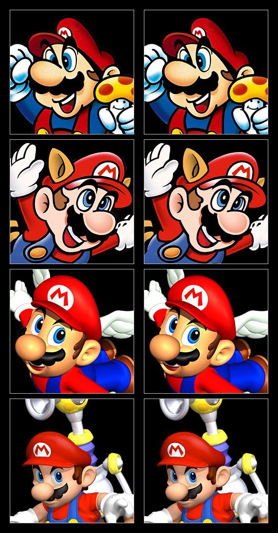 You can see the comparisons below (original on the left, new on the right). Out of these, the Super Mario Bros. 3 icon (the second one) in the top right seems to be the easiest to see the differences.