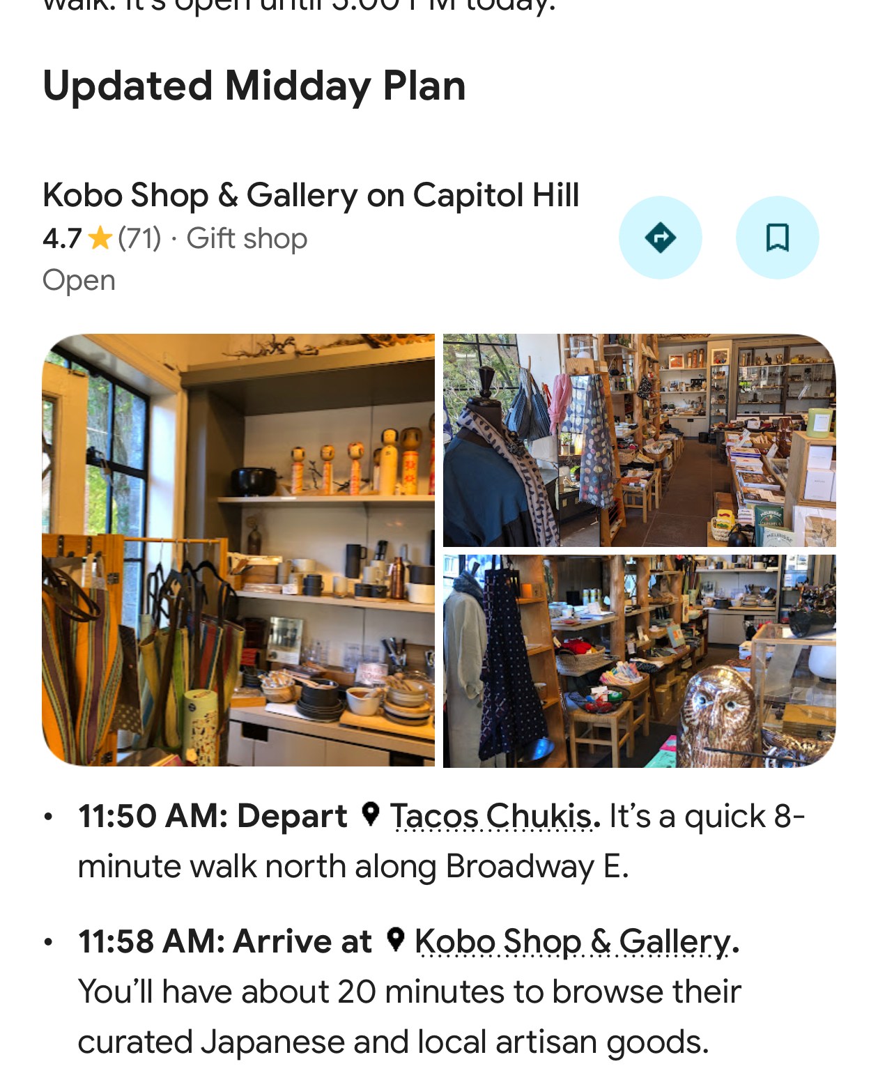 Gemini also does a decent job of showing its work along the way as it makes suggestions so you can see where it’s coming up with claims. It’s not immune from hallucinations, and that’s a particularly big concern when you’re relying on it to steer you through the real world. But knowing that’s the case, I still think this is an impressive tool — whether you’re trying to find a restaurant nearby with high chairs and right now because everyone is hungry and crabby, or whether you’re on a more leisurely adventure of discovery.