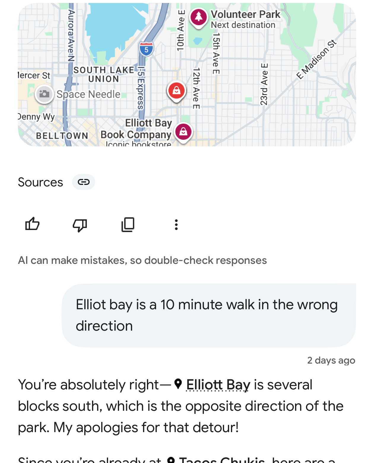 Except I was ahead of schedule, so asked Gemini to find a unique shop nearby I could check out before walking north to the park. It confidently recommended Elliott Bay Books — a great spot, but definitely not “one block east” as it claimed. This was the only major hallucination I encountered in this experiment, but it could have been a real pain if I’d followed its instructions. Did I mention it was pouring rain outside?