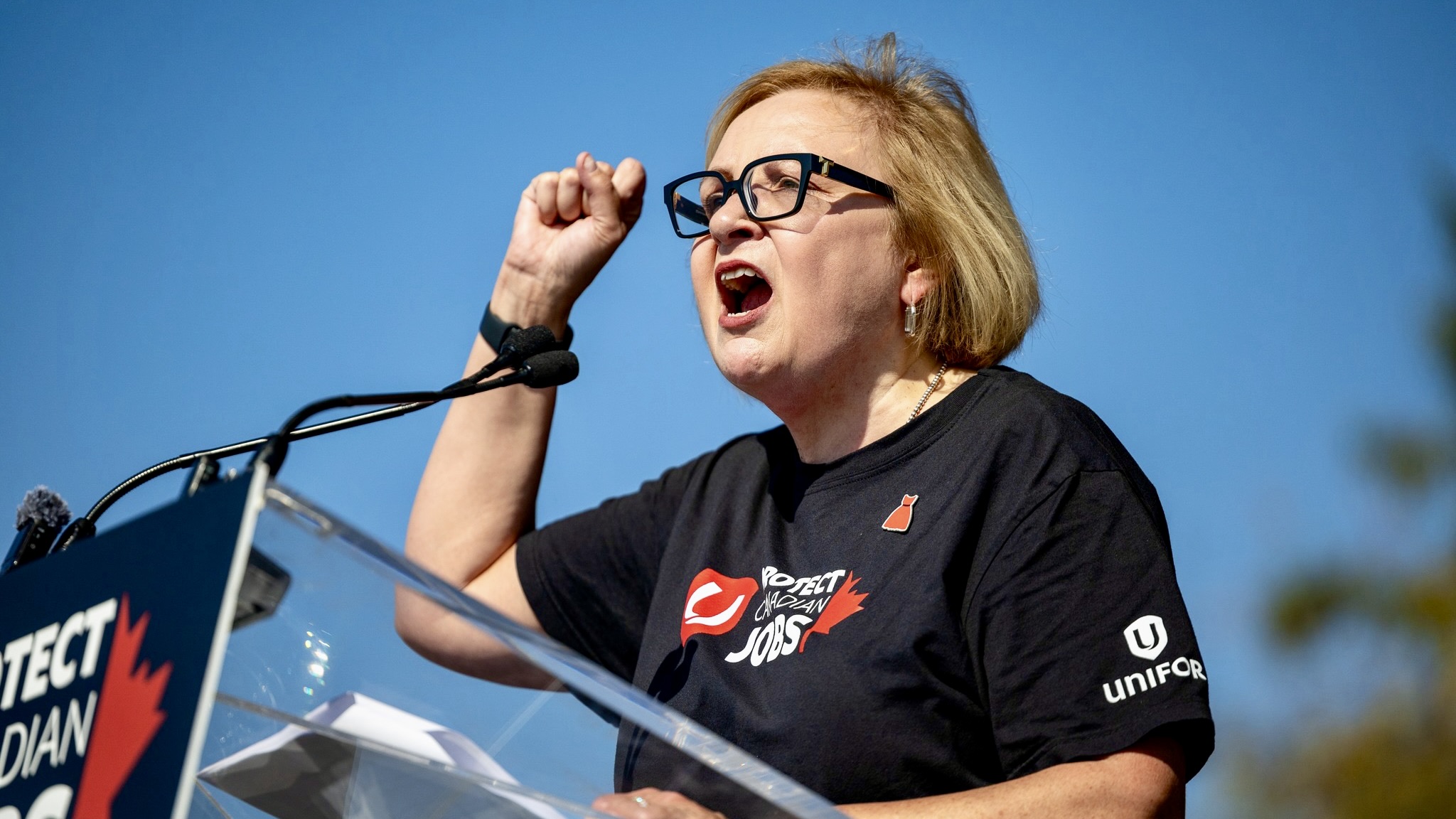 Unifor President Lana Payne speaking at the October 2025 Brampton Rally. (Unifor).