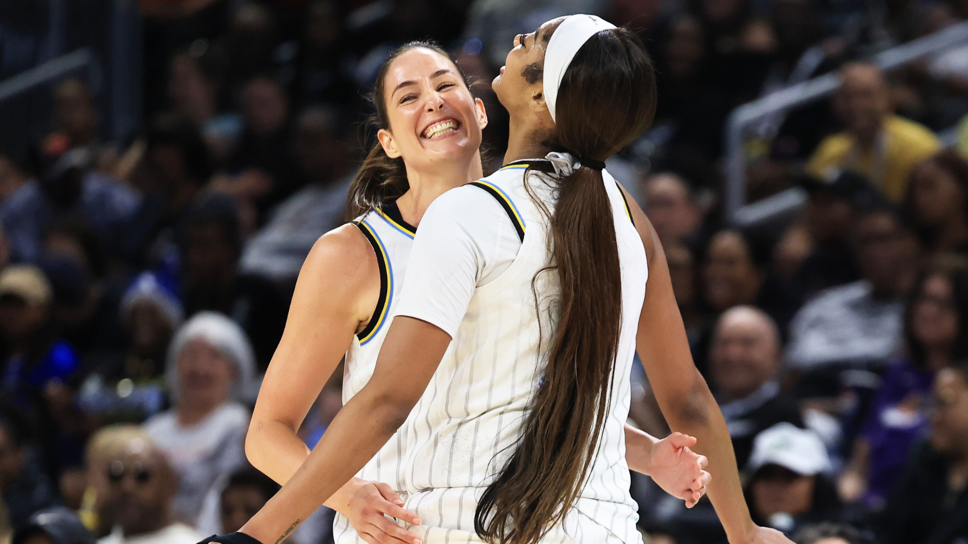 GettyAngel Reese #5 of the Chicago Sky celebrates with teammate Rebecca Allen #9 during the second half against the Connecticut Sun at Wintrust Arena on August 23, 2025 in Chicago, Illinois.