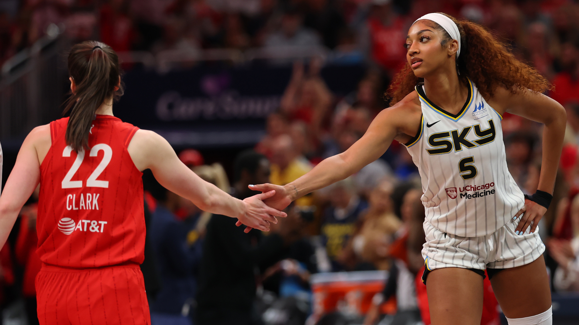 GettyAngel Reese #5 of the Chicago Sky and Caitlin Clark #22 of the Indiana Fever meet at mid court prior to tipoff for the Fever’s home opener at Gainbridge Fieldhouse on May 17, 2025 in Indianapolis, Indiana.