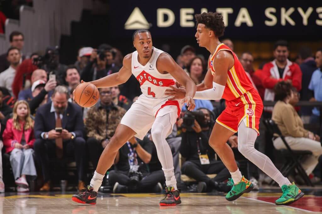 Scottie Barnes backs down Jalen Johnson during a Raptors-Hawks game in November. (Brett Davis / Imagn Images)