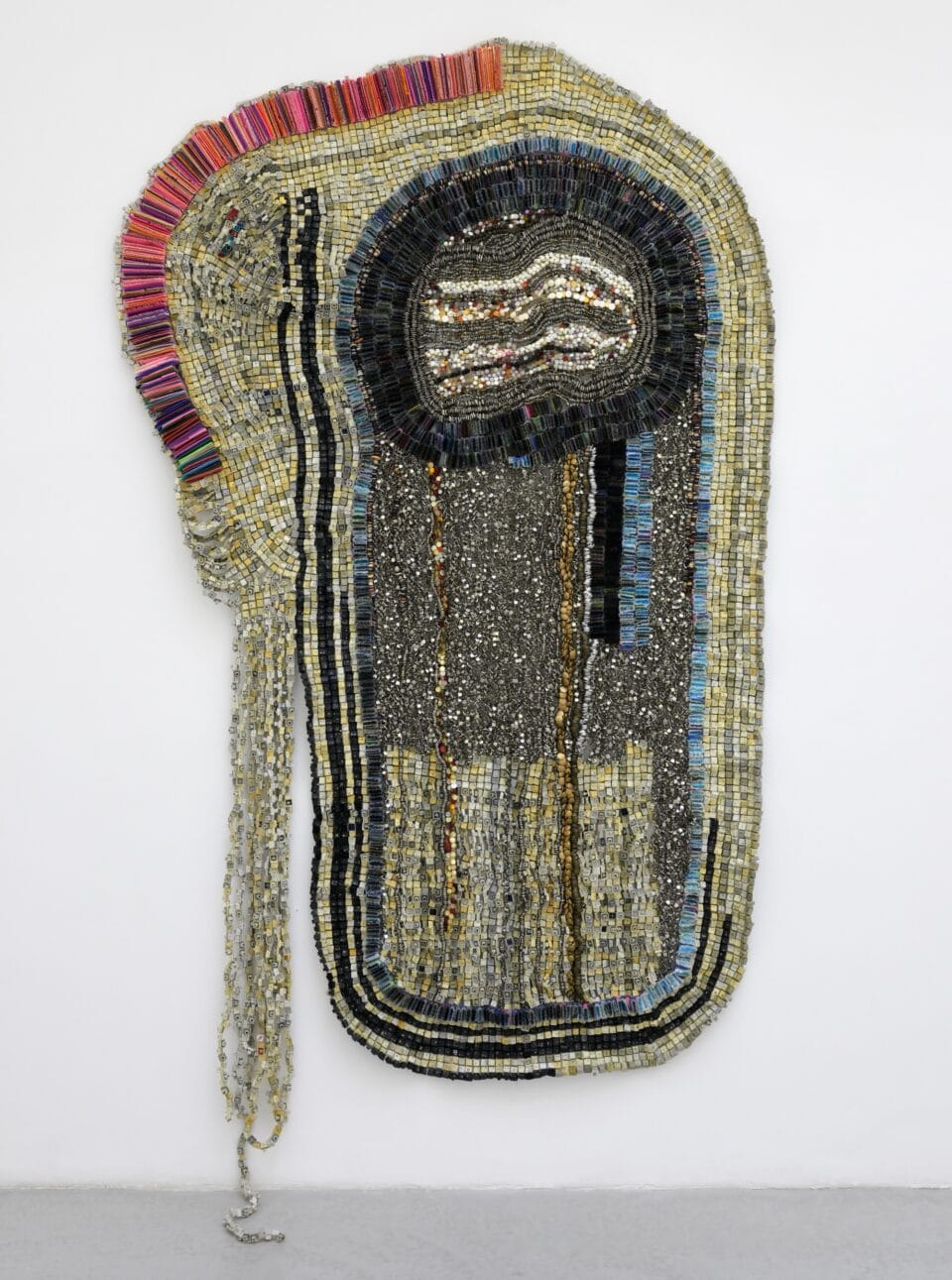 an abstract wall-installed artwork by Moffatt Takadiwa made from computer keyboard keys, combs, toothbrush heads, and pieces of nail polish applicators“The Crown (2)” (2026), keyboard keys, plastic toothbrush heads, and nail polish parts, 72 1/16 x 55 1/2 inches