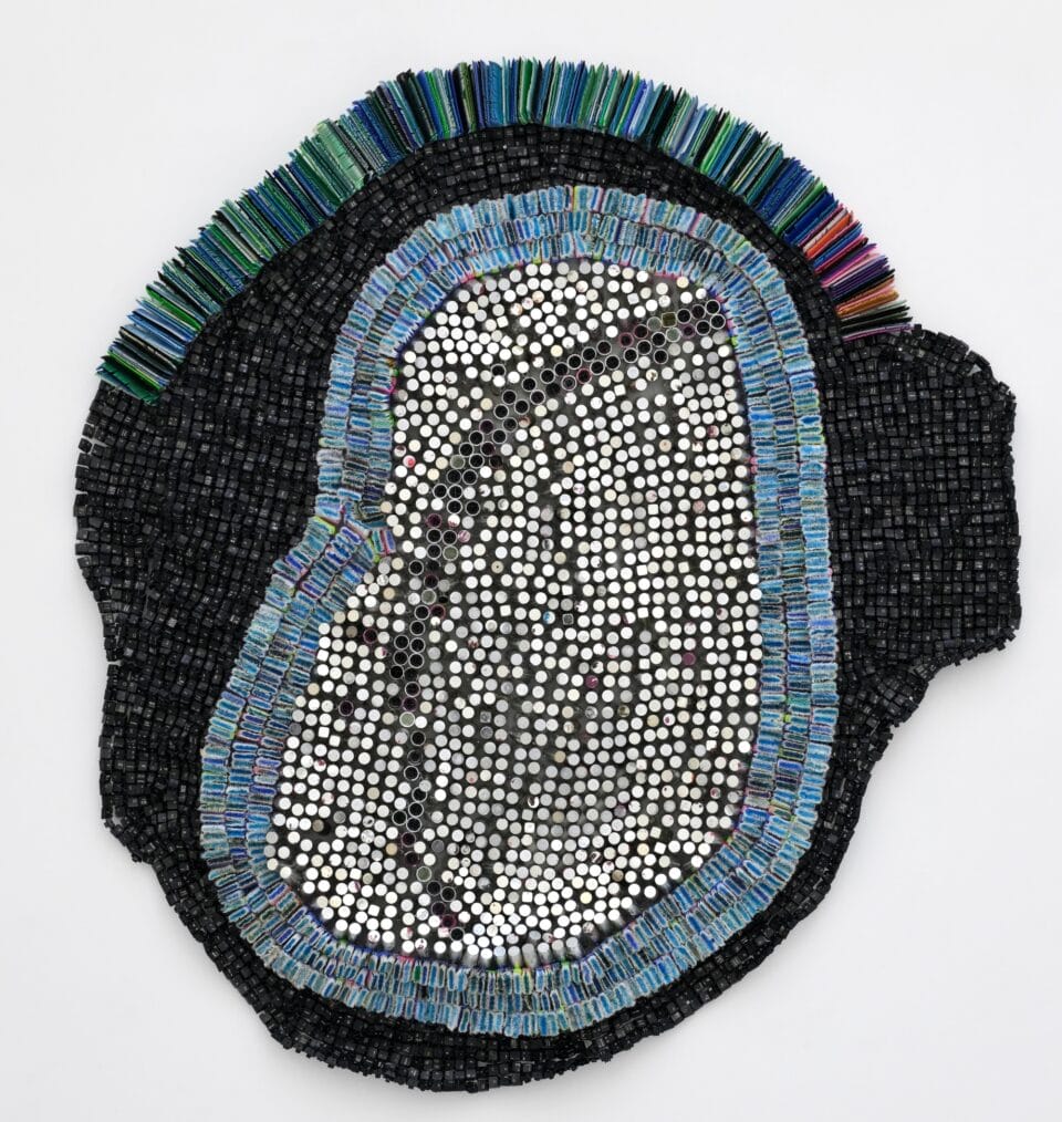 Takadiwa is known for his elaborate sculptures made from what he describes as “everyday consumer residue”—discarded computer keyboard keys, toothbrush heads, plastic combs, buttons, and more. The colors, textures, and patina of wear and age produce patterns that it’s tempting to describe as “organic,” even though the materials are the opposite.