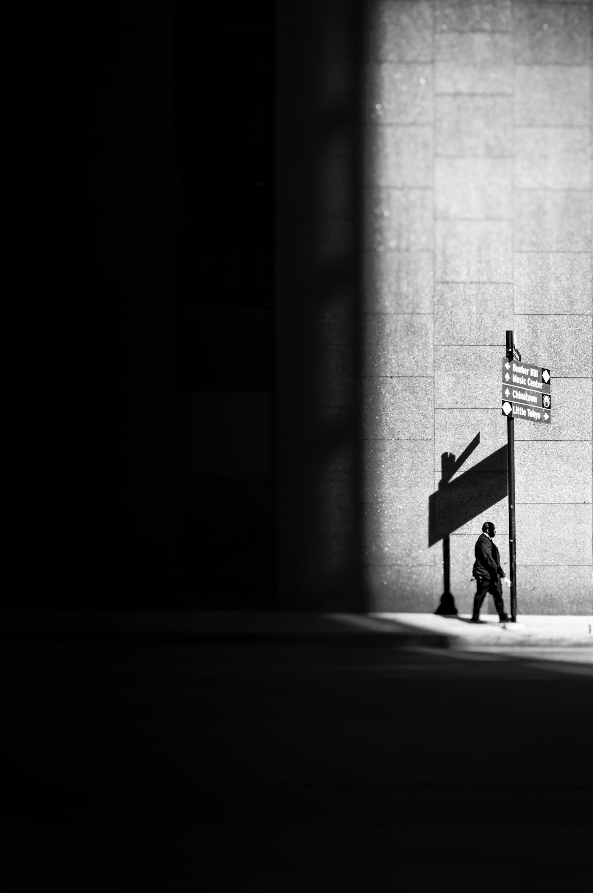 a black-and-white photograph by Daniel Sackheim in a noir style of a figure walking next to a large building amid deep shadows, with a silhouetted pigeon flying above“LOWER GRAND AVENUE”