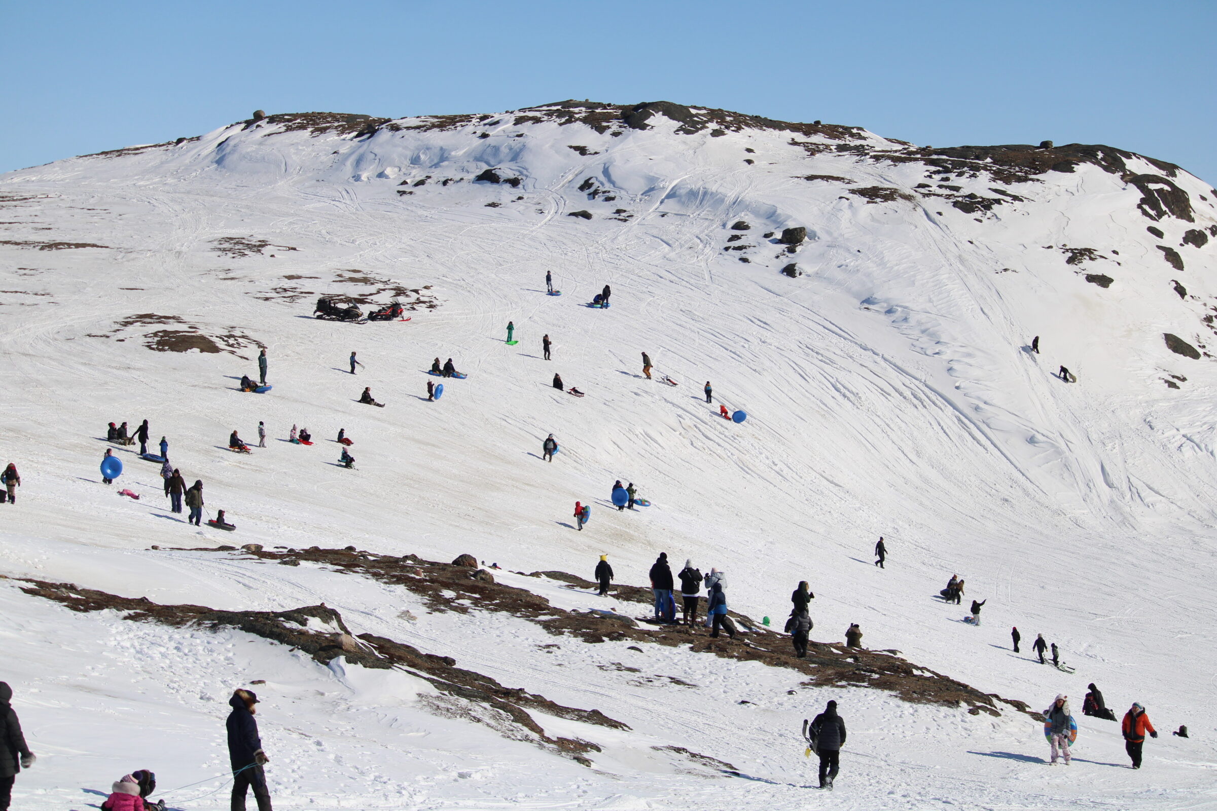 Participants toboggan down a hill in Iqaluit during Toonik Tyme festivities in 2025. (File photo by Arty Sarkisian)