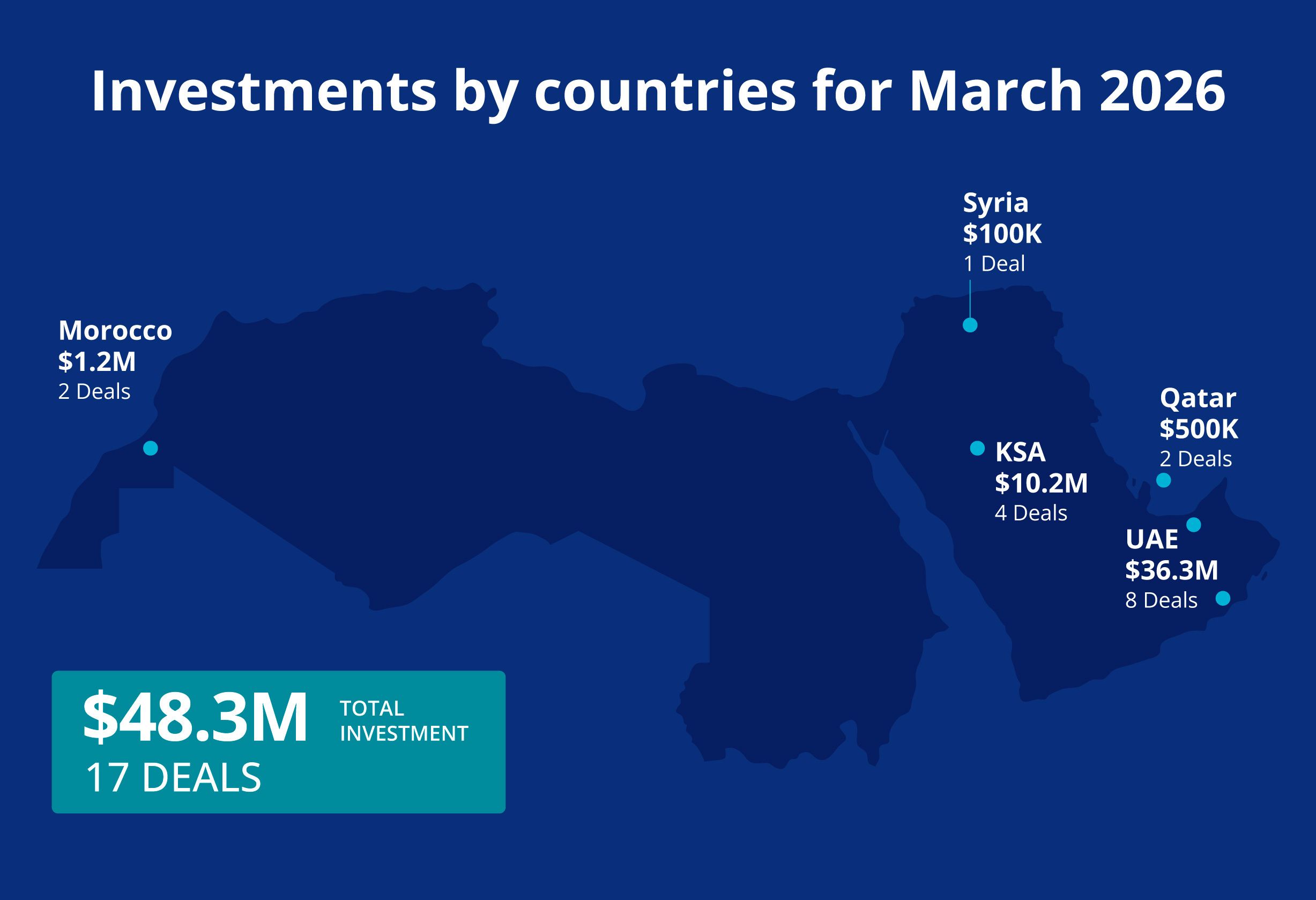 In its place, Morocco ranked third with $1.2 million across two deals, followed by Qatar with a single $500,000 round and Syria with one deal estimated at $100,000.