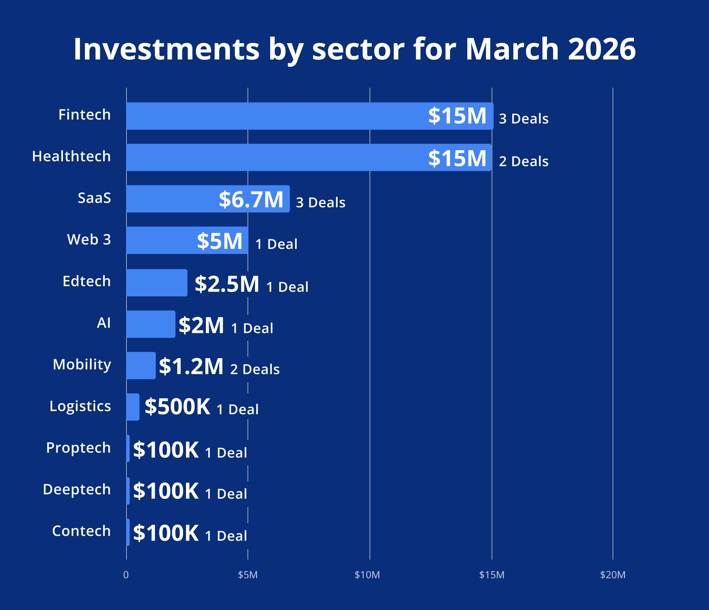 Fintech remained the leading sector, attracting $15.1 million across three deals, continuing to benefit from its infrastructure-like positioning within the digital economy.
