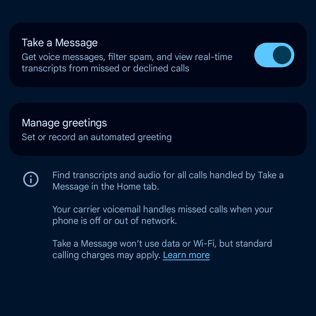 Once available, you’ll be prompted at the top of the Home tab to add “A personal touch on your missed calls” that are handled by Take a Message. You can also access custom greetings in the future by going to Settings > Take a Message.