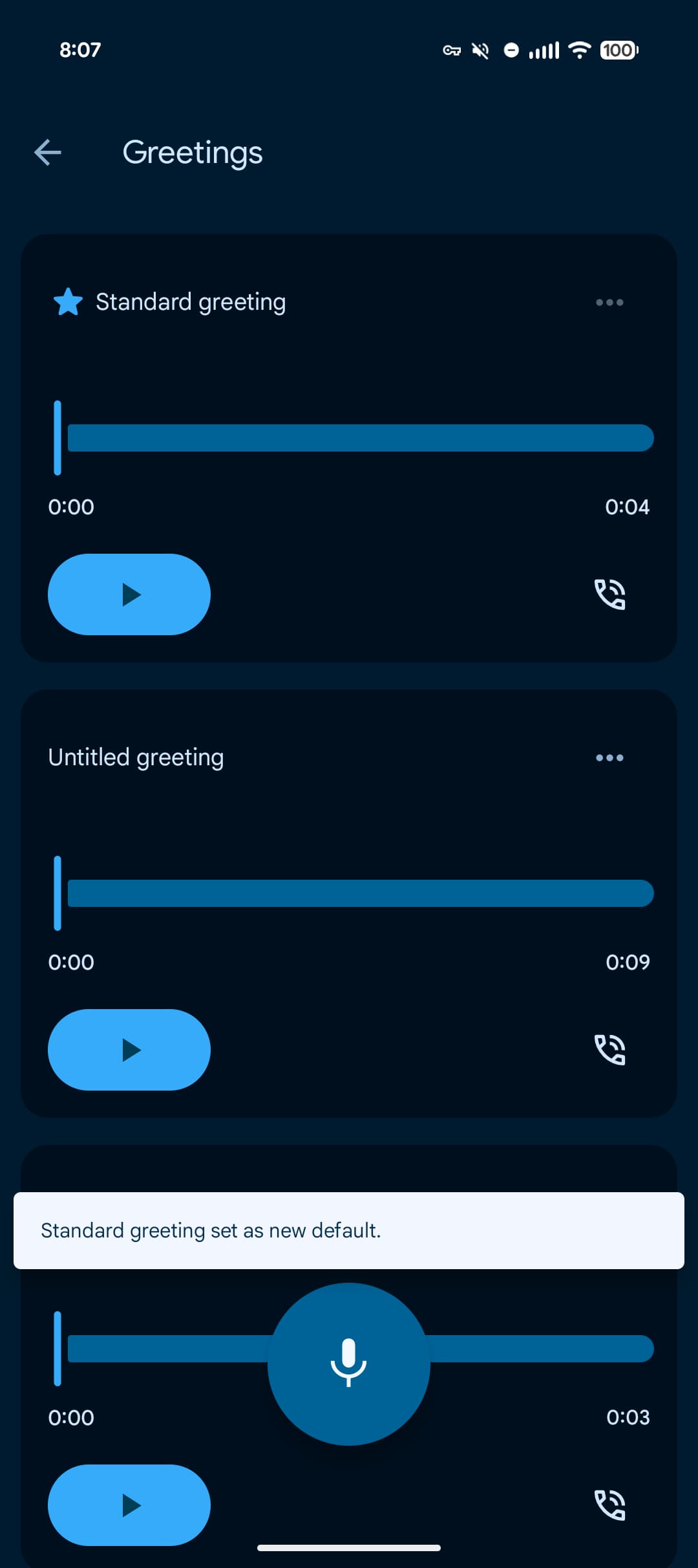 You can have multiple recordings stored in Greetings, with the active one marked by a star. Use the three-dot overflow menu to “Set as default.”