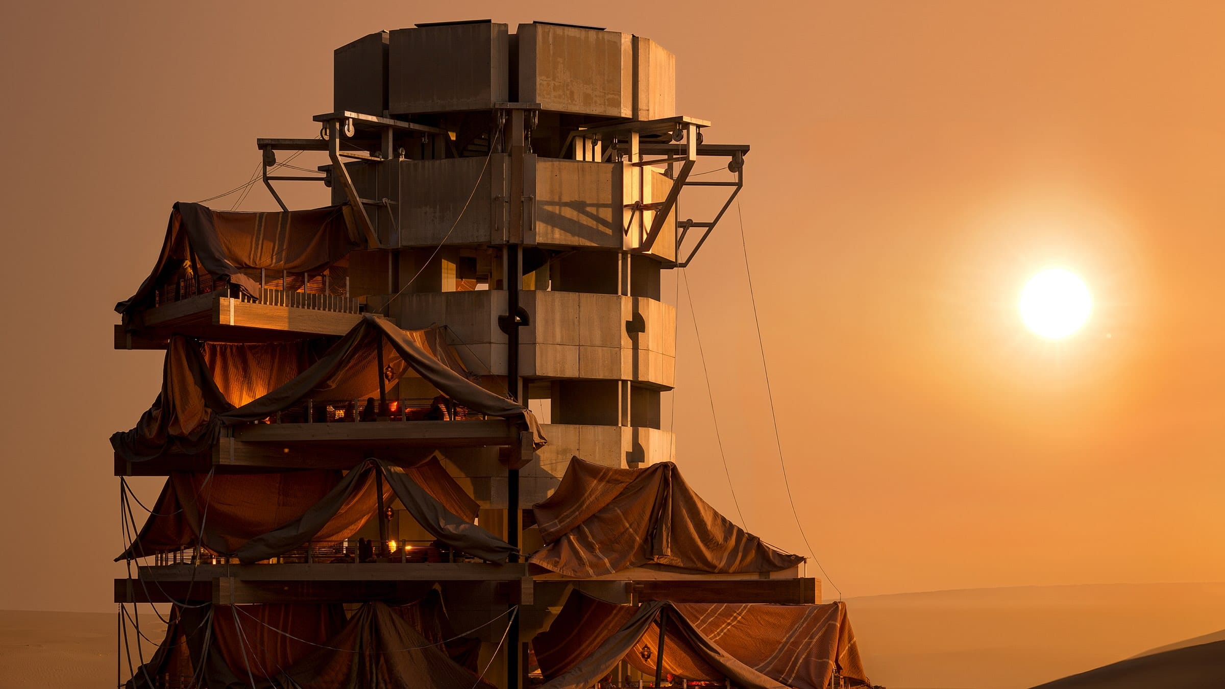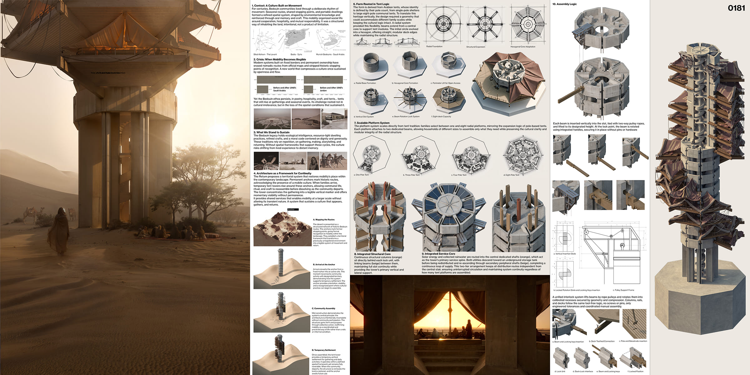 Description excerpt: “The Return proposes a territorial system that restores mobility’s place within the contemporary landscape. Permanent anchors placed along historic routes acknowledge a mobile people, reinstating a network long absent from contemporary mapping. When families arrive, temporary tent towers rise around these anchors, enabling communal life, ritual, and craft to reassemble before dissolving as the community departs. The tower consolidates shared services, energy, water routing, and essential support, introducing a level of mobile infrastructure never before available to nomadic communities while preserving the transient character of settlement. It sustains a culture that appears, gathers, and returns.” Read more about the project here.