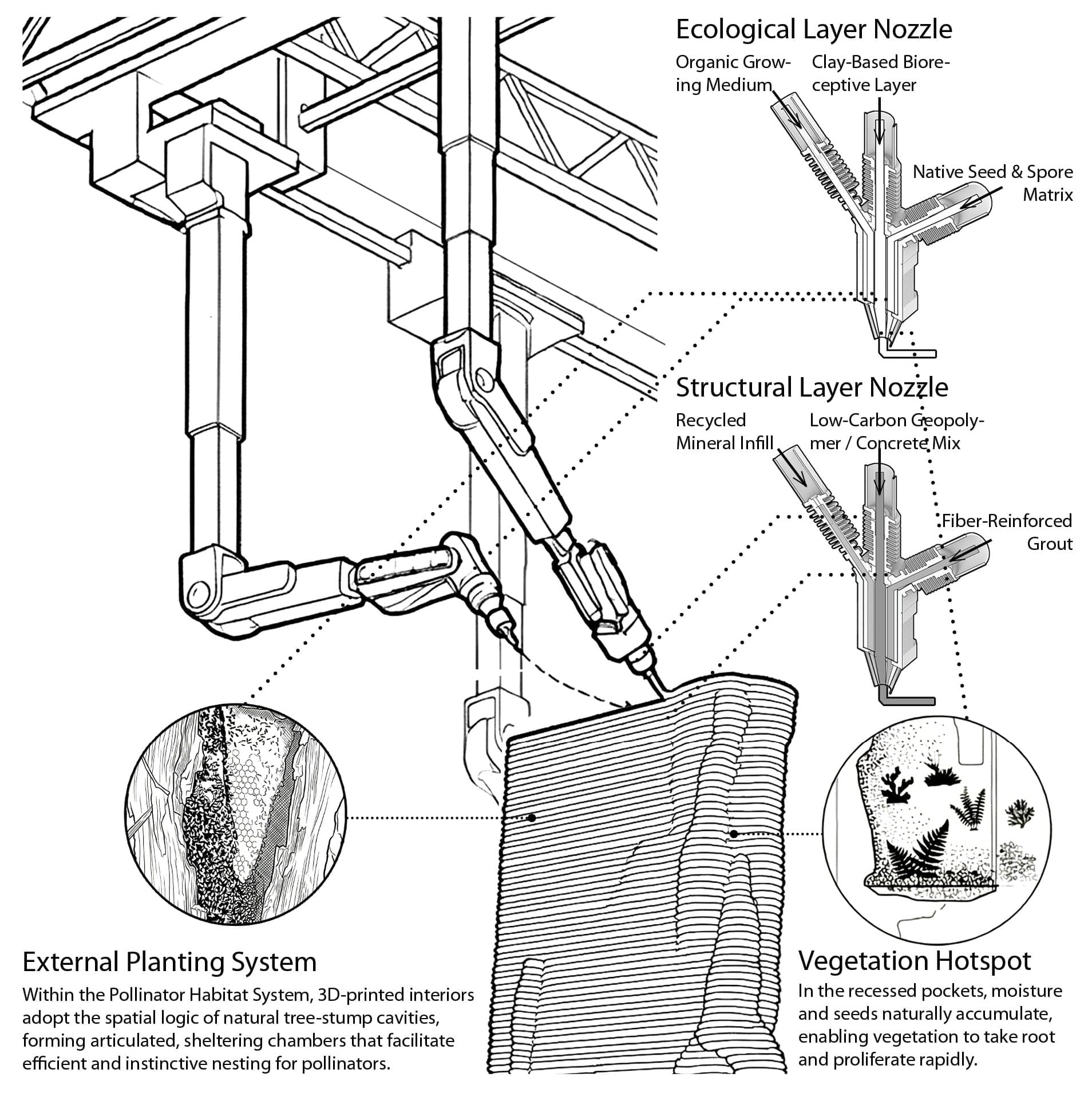 “At the core of the proposal is a 3D-printed façade system designed as a living ecological skin. Instead of functioning as a sealed envelope, the façade forms a network of cavities, pockets, and microclimates capable of retaining moisture, accumulating organic matter, and supporting vegetation growth. These conditions enable mosses, lichens, and flowering plants to establish over time, creating a stable habitat for pollinators above the fragmented and chemically treated ground plane.”