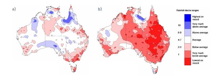 During the ‘strong’ 1997–98 El Niño (a), rainfall didn’t change much. But during the ‘weak’ 2002–03 El Niño (b), major rainfall deficits emerged.