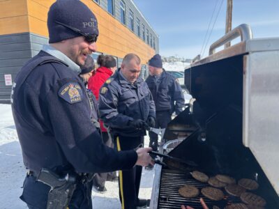 RCMP Const. Andrew McAllister, left, and Sgt. George Henrie tend the grill at the Toonik Tyme barbecue in front of police headquarters in Iqaluit on Friday. (Photo by Daron Letts)