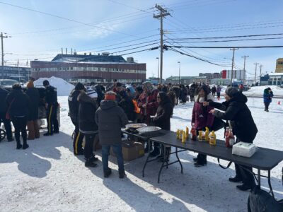 Hundreds of people line up for the free Toonik Tyme barbecue hosted by officers at RCMP V Division headquarters in Iqaluit on Friday. (Photo by Daron Letts)