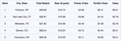Composed of a 6-pack of beer, potato chips, tortilla chips, and a jar of salsa, the service analyzed and averaged data across Walmart, Target, Costco, Aldi, Kroger, H-E-B, Safeway, Publix, and Food Lion.