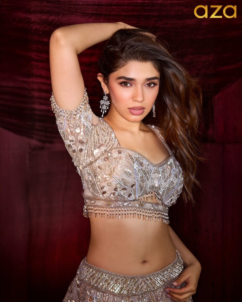 But none of that shows in her latest stunning photoshoot for Aza. In the first look, she dazzles in an embroidered ivory lehenga with intricate silver threadwork, paired with chandelier earrings and flowing wavy hair.