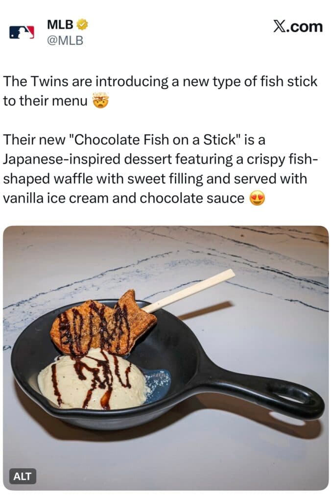 The Minnesota Twins are offering what is basically a Taiyaki (fish-shaped waffle with sweet filling) as a dessert this year.