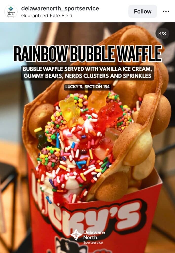 The Chicago White Sox decided to bring every dentist’s worst nightmare into reality. This bubble waffle comes with vanilla ice cream, gummy bears, Nerds candy clusters and sprinkles. One or two bites of this will give you enough sugar for the week, and I strongly advise fans not to visit their dentists for at least two weeks after attempting to consume this dessert.