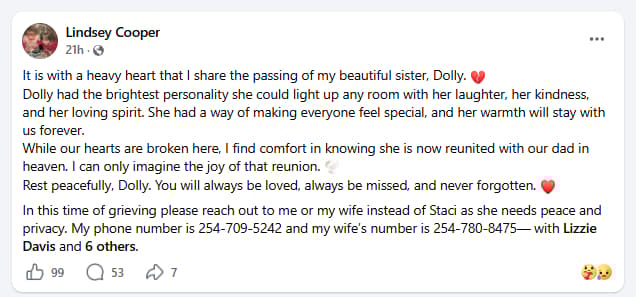 In the tribute, Lindsey remembered Dolly for having the “brightest personality” and said her laughter and kindness could light up any room. She also wrote that the family was heartbroken and said she found comfort in believing Dolly had been reunited with their father.