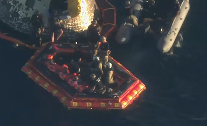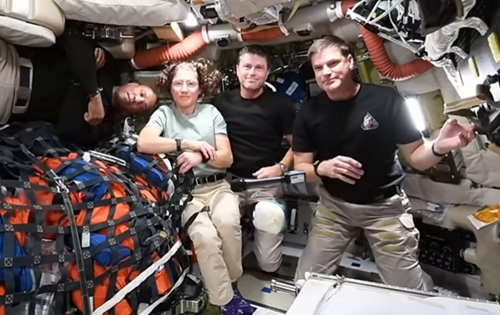 artemis II, astronauts, in raftThe four Artemis II astronauts ‘on the porch’ (a raft for use outside their space capsule after splashdown), on April 10, 2026. [NASA livestream]