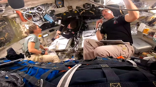 packing up, Artemis II, on OrionOn Day 9 (April 9, 2026) of their journey, the Artemis II crew starting packing up the cabin to prepare for re-entry to the Earth’s atmosphere on Day 10. [NASA livestream]