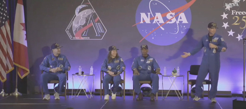 artemis ii, astronautsArtemis II crew on board Integrity on April 8, 2026 during live chat with the Canadian Space Agency. [NASA livestream]