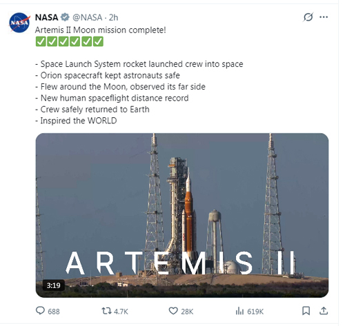 On April 12, NASA gave themselves six check marks for Artemis II Moon mission complete (as posted by NASA on April 12, 2026):