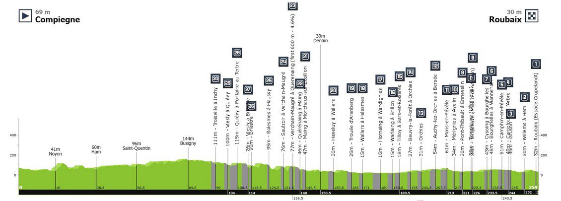 The 123nd Hell of the North offered up 30 bone-jarring cobbled sectors totaling 55.3 of 258.3 total kilometers. Starting in Compiègne, the first sector of pavé greeted the riders at Troisvilles at kilometer 95. The 2.3-km Trouée d’Arenberg at kilometre 163 was the first five-star sector. The other five-star cobbles were 3-km Mons-en-Pévèle (kilometre 209) and 2.1-km Carrefour de l’Arbre (kilometre 241). The famous Roubaix Velodrome is where the champion would be crowned.