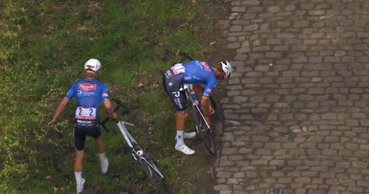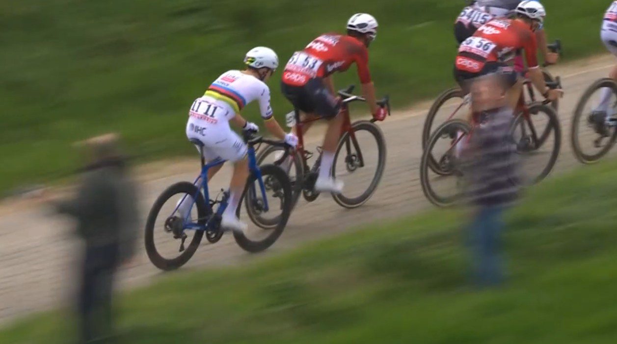 Pogačar carried on with van Aert, Pedersen, Jasper Stuyven, Christophe Laporte, Stegan Bissigger, Filippo Ganna and Laurence Pithie. Both Ganna and Pithie would succumb to flats. The world champion had another rear mechanical. On *** Warlaing à Brillon, van Aert had his own puncture.