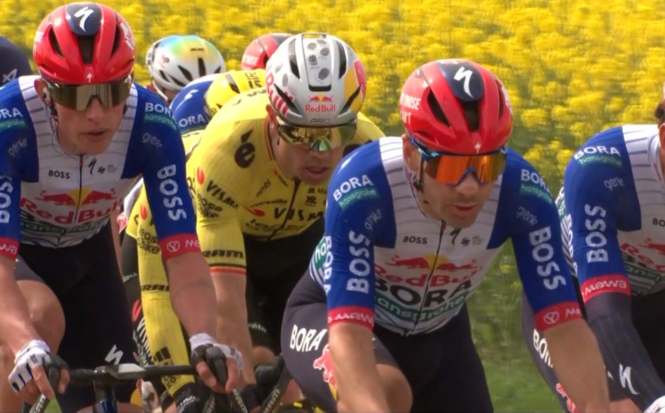 The peloton was intact on the first couple of sectors of cobbles although there had been plenty of chaos with mechanicals. UAE-Emirates pulled the peloton on Sectors 27 and 26, Alpecin-Premier Tech close on its heels. The pressure split the peloton.