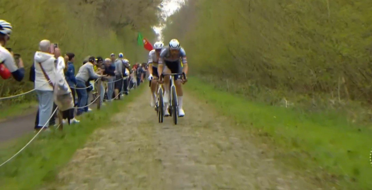At the midway point, the average speed was 51.8 km/h. On *** Quérénaing à Maing Pogačar got a rear flat and had to take a Shimano neutral service bike. Alpecin-Premier Tech tried to bury him. He finally got a team bike on Sector 21 and was 30 seconds back by Sector 20.
