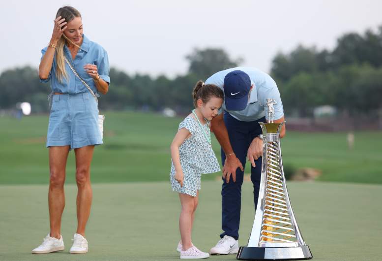GettyDUBAI, UNITED ARAB EMIRATES – NOVEMBER 16: Rory McIlroy of Northern Ireland inspects the Race to Dubai trophy on the 18th green with his Daughter, Poppy as his Wife, Erica, looks on on day four of the DP World Tour Championship 2025 at Jumeirah Golf Estates on November 16, 2025 in Dubai, United Arab Emirates. (Photo by Richard Heathcote/Getty Images)